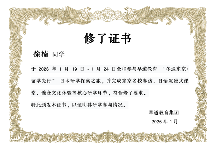 ✅日本研学修了证书(可作为留学申请中 “海外实践经历” 的补充材料)
